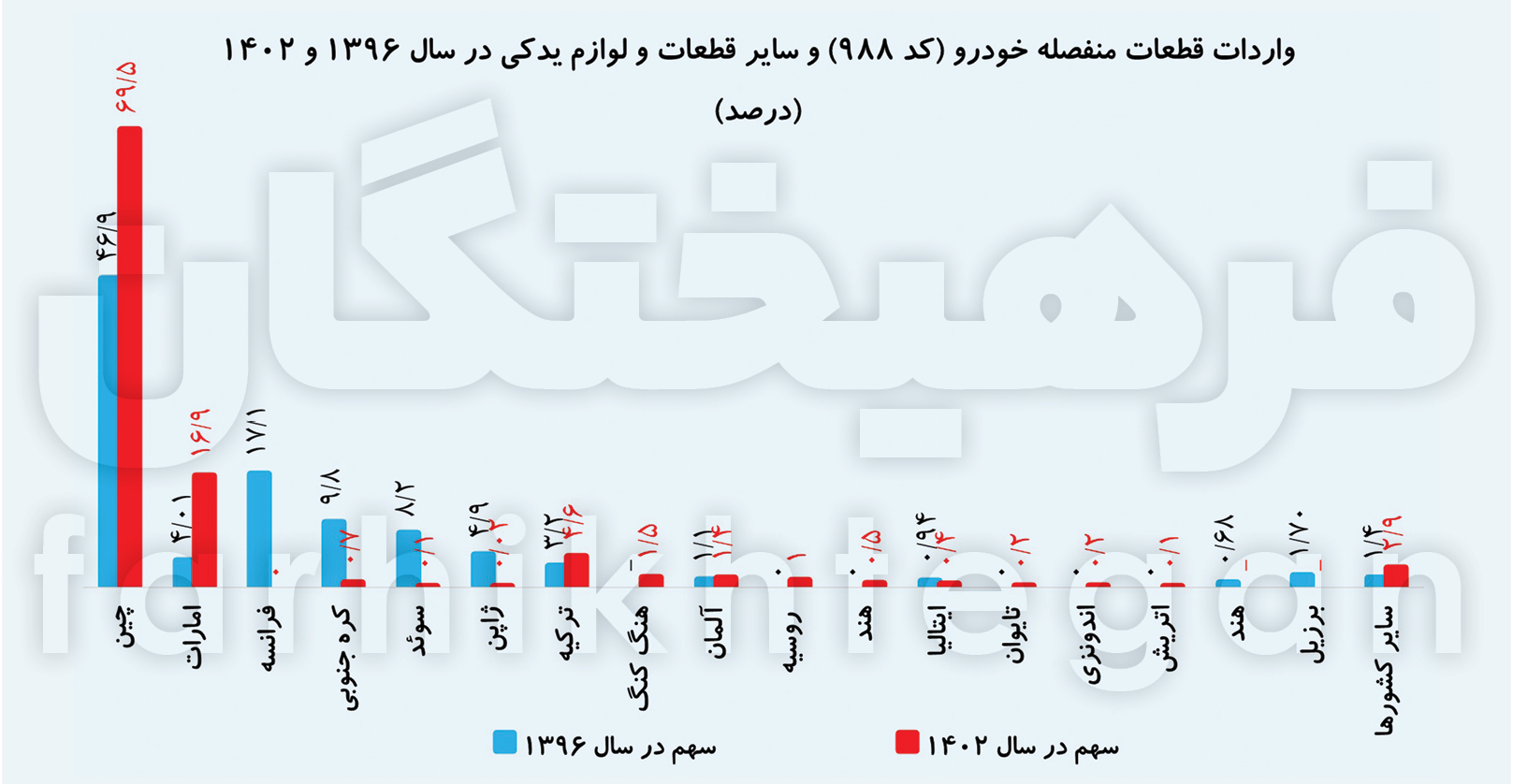 فرانسه با برندهای خودرویی مشهور نظیر پژو و رنو، سهم قابلتوجهی در تأمین قطعات خودرو برای ایران دارد. واردات قطعات از سوئد در سال 96 ۴۲۳ میلیون دلار محاسبه شده است که که حدود ۱۰.۳ درصد از کل واردات قطعات SKD و CKD را شامل میشود. این کشور با برندهایی مانند ولوو در صنعت خودرو سازی ایران جایگاه ویژهای دارد. واردات از کرهجنوبی ۴۰۳ میلیون دلار بوده که معادل ۹.۸ درصد از کل واردات است. کرهجنوبی با برندهایی نظیر هیوندای و کیا در تأمین قطعات خودرو برای بازار ایران نقش برجستهای ایفا میکند. این دادهها تنوع تأمین قطعات صنعتی و خودرویی از کشورهای مختلف به ایران در سال 96 را نشان میدهد؛ جالب توجه است که حجم زیادی از واردات قطعه به ایران در سال 96 وابسته به چین بوده و سهمی بالغ بر 40 درصد را به خود تخصیص داده است.