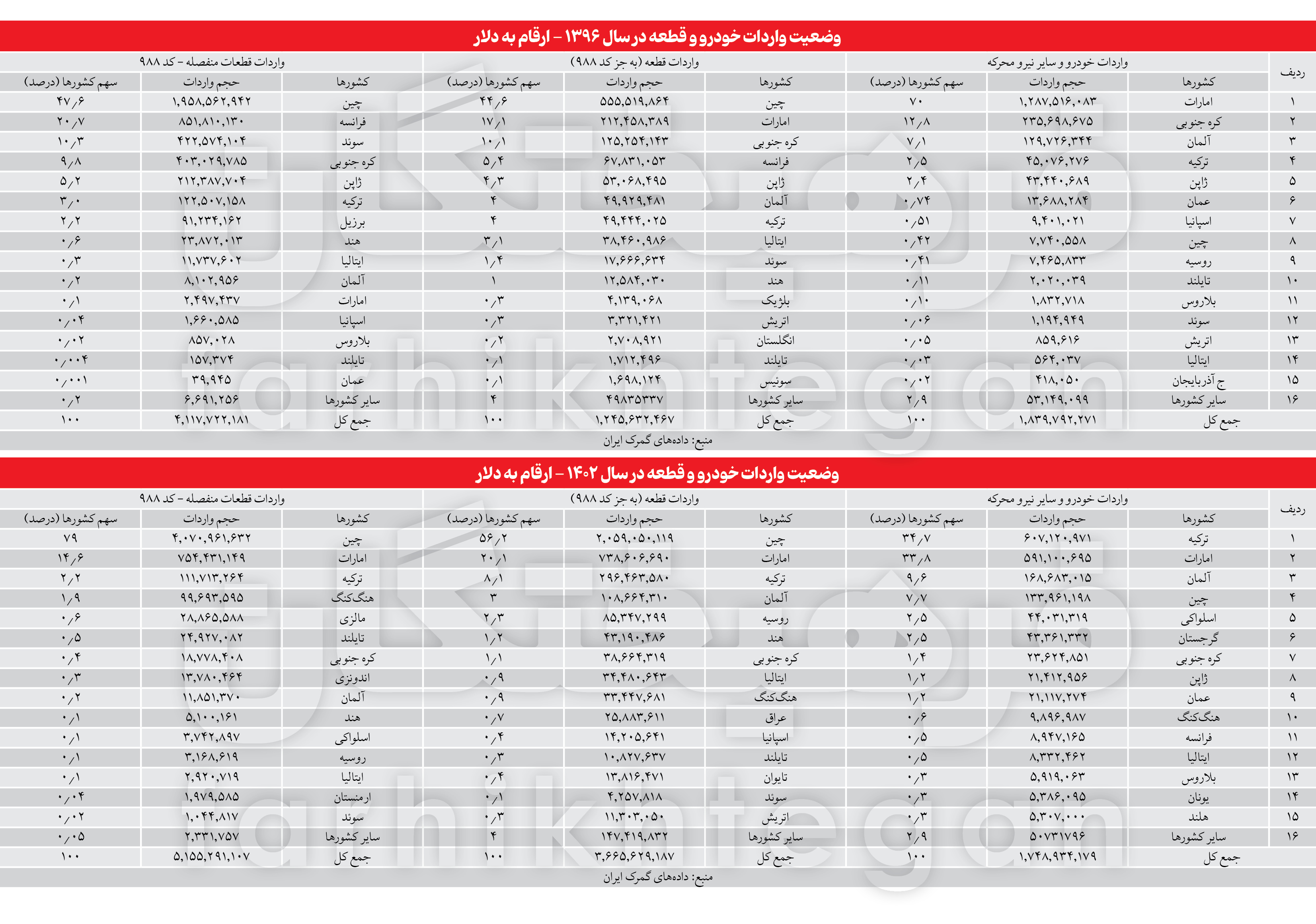 بررسی دادههای واردات خودرو (شامل خودروهای سواری، تجاری، ماشینآلات کشاورزی و تراکتور، ماشینآلات معدنی و…) در سال 96 و مقایسه آن با آمارهای سال 1402 از اطلاعات جالبی پرده برمیدارد. قابل توجه است که بیشترین طرف حسابهای ایران در سال 96 برای واردات خودرو آماده که معادل یک میلیارد و 800 میلیون دلار اعلام شده است، کشورهایی ازجمله امارات با حدود 70 درصد سهم، کره جنوبی با 12.7 درصد سهم، آلمان با 7 درصد سهم، ترکیه با 2.4 درصد سهم و ژاپن با 2.3 درصد سهم بودهاند.